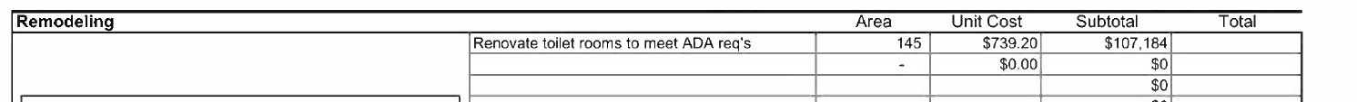 - ADA compliance: $107,184 (145 sq ft @ $739.20 per sq ft)