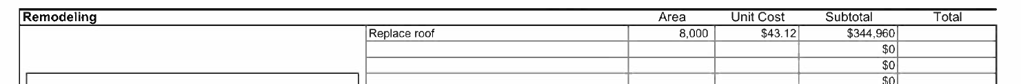 - Roof cost: $344,960 (8,000 sq ft @ $43.12 per sq ft)